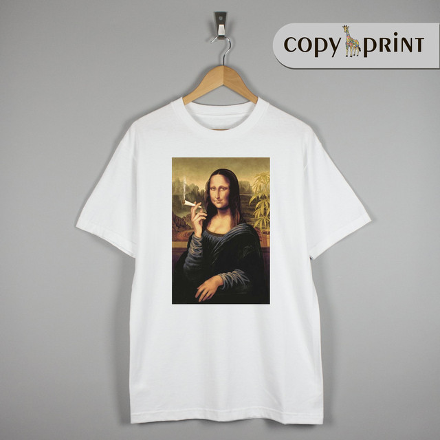 Футболка з принтом на тему всесвітньо знаменитої картини, відомого худовжина Леонадрно Да Вінчі (Leonardo da Vinci), цікава, у гумористичній формі обробка композиції картини. Мона Ліза (Mona Lisa).