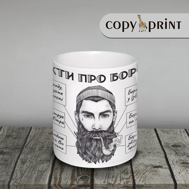 Опис: Чашка з для щасливого володаря бороди. Погладжуючи бороду, Ви збільшуєте свої розумові здібності. Борода фільтрує брудне повітря. Над людиною з бородою складно жартувати, оскільки Ви виглядайте брутально. Борода викликає заздрість у їзбородих. Борода захищає
